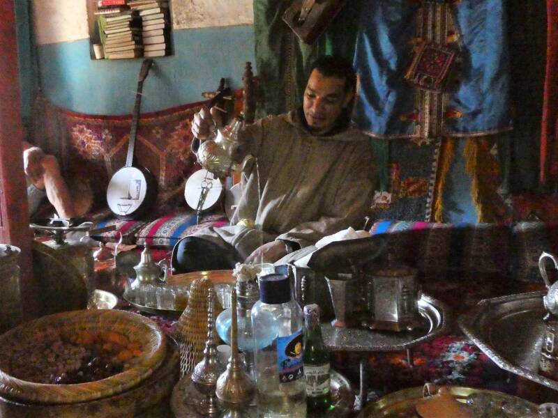 Omdat we Ali, onze tajinekoerier hier, nog niet gezien hebben, bellen we hem voor een bestelling. We hebben een erg oud kaartje met een telefoonnummer van hem. En dat werkt nog steeds. Zo tegen half zeven wordt de tajine bezorgd. Het smaakt weer voortreffelijk en het was deze keer wel erg veel. Hebben we morgen ook nog wat.