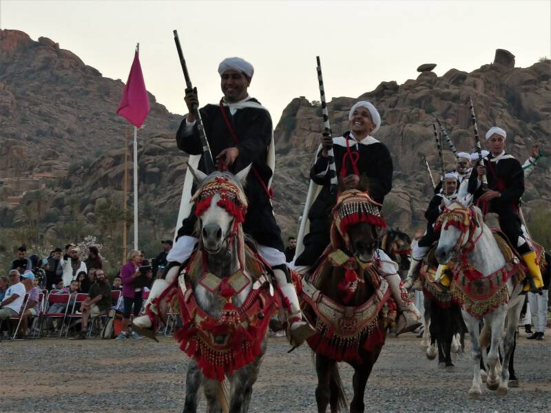 Aan het einde van de middag gaan we nog even het dorp in. Het is er druk en her en der bespeur je een zekere opwinding vanwege de festiviteiten de komende dagen. En die beginnen vanavond al. Terug bij de camper horen we een paar enorme knallen. Op een groot vlak terrein achter de camperplaats vindt de aftrap plaats van het tiende Amandelbloesemfestival. Met muziekgroepen en het paardenspektakel "Fantasia". Een rij fraai uitgedoste ruiters op paarden die naast elkaar in galop het terrein oversteken en halverwege hun geweren leegschieten. Liefst tegelijk, wat een enorme knal oplevert, vooral in dit dal tussen de bergen. We hebben dit spektakel al vaker gezien, maar weten nog steeds de betekenis niet. Desondanks een leuk begin van het festival.