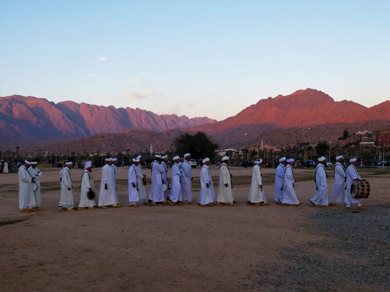 Voor in de avond begeven we ons in het feestgewoel. En we moeten nog armbandjes kopen voor een kleindochter. We wandelen langs de talrijke kramen met streekproducten. Heel veel zalfjes, argaanolie, zeepjes, amelou, dadels enzovoort. Het is enorm druk op het grote plein. Maar we hebben het hele gebeuren wel eens uitbundiger meegemaakt. Deze keer ook geen "oud-Marokkaanse" spelletjes als zaklopen, koekhappen en spijkerpoepen. We hebben de indruk dat de afgelasting van de vorige editie, op het allerlaatste moment, er financieel flink ingehakt heeft en dat het dit jaar een tandje minder moet. We hebben nog een tijdje heerlijk op een terras naar de drukte zitten kijken. En ook nogal bijzonder, tijdens een optreden van het Tafraouts mannenkoor, schalt plotseling vanuit de moskee naast ons de oproep voor het gebed. Het koor maakt het couplet af, waarna de imam de oproep af kan maken. En er vervolgens een hele stoet op gang komt van moskeegangers. De mannen door de hoofdingang, de vrouwen hebben een eigen ingang.