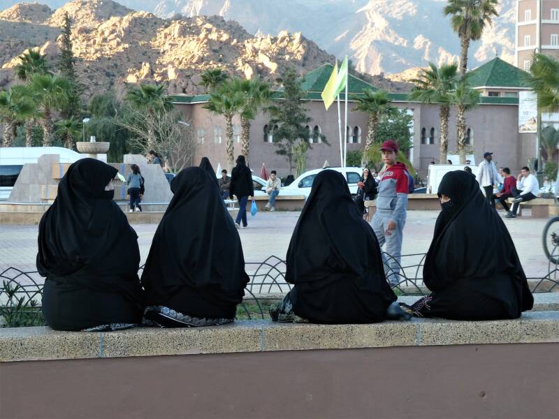 Na de middag gaan we nog even fietsen. Eerst moet er geld gepind worden. Zoals vaker hier in Marokko op zondag, is bij twee banken het geld op. Gelukkig vinden we nog een derde bank waar één van de twee pinautomaten nog wel werkt. Het is zo wie zo handig om geld te pinnen op tijden dat de bank geopend is. Mocht er wat mis gaan dan kun je binnen verhaal halen of om raad vragen. Het komt een enkele keer voor dat er geen geld uit de automaat komt en er wel een bedrag van de rekening afgeschreven wordt. Voor zover wij weten wordt dat uiteindelijk wel gecorrigeerd, maar is een hoop gedoe. We fietsen nog even door naar het strand bij de "Duivelsrots". Daar is het druk; hele families hebben zich op het strand geïnstalleerd. Vanaf een bankje hebben we een mooi overzicht op het gebeuren.