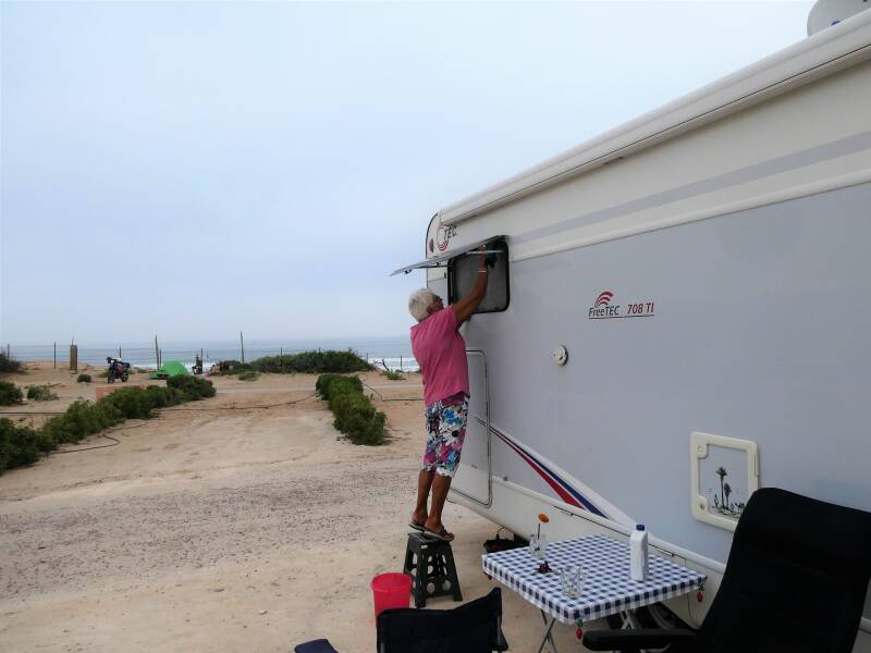 Ook deze dag begint bewolkt en het waait hard. Maar zoals bijna alle voorgaande dagen verdwijnen de wolken en de wind in de loop van de ochtend en wordt het opnieuw een mooie dag. De ochtend wordt besteed aan wassen. Het dak van de camper moet nog ontdaan worden van een bruine laag stof, en er moeten weer kleren gewassen worden. Het dak van de camper doen we zelf, de kleding wordt grotendeels gedaan door de wasmachine van de camping. Dat kost vier euro plus één euro: vier euro voor een "wasticket" en één euro contant aan de wasmevrouw. Omdat we een grote wasmachine nodig hebben.