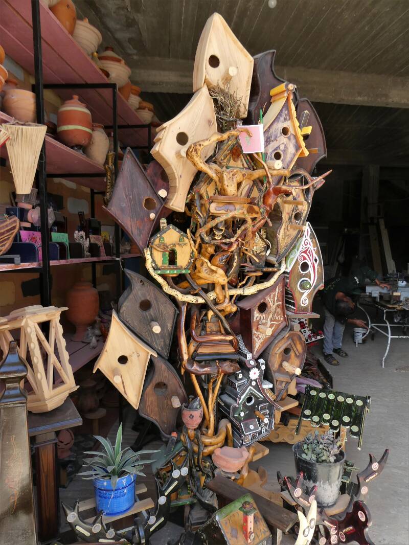 Een zeer gevarieerde dag: fietsen, shoppen, eten en een afscheidsreceptie. Om te beginnen het fietsen. We gaan met Frank, Ria en Gerrie naar Agadir. Weer langs de de prachtige boulevard van Anza en het smerige industriegebied rondom de haven. Om tenslotte uit te komen bij de jachthaven aan het begin van de boulevard. En in die haven ligt de beroemde driemaster de Jack Sparrow. Het schip uit de film Pirates of the Caribbean met Johnny Depp. Na een reparatie kun je over een dag of vijf mee voor een tochtje á vijftien euro per uur. Maar zo lang blijven we niet meer in deze buurt. We fietsen weer de boulevard af en belanden opnieuw bij de supermarkt Marjane. Wij hebben niets nodig dus duiken we het restaurant in voor cappuccino. Dat duurt nogal omdat de kassa even niet werkt. Uiteindelijk zitten we aan die cappuccino, althans volgens de bedienende mevrouw. Volgens ons is het chocolademelk. Terug in het centrum van Agadir gaan we eten en nemen nog een kijkje bij de Uniprix. Daarnaast zit een handelaar met souvenirs. En als er iemand het spel van loven, bieden, weglopen en terugkomen kent, is het Gerrie wel. En met succes. Een vermakelijk schouwspel. Op de terugweg, een eindje voor de camping, zit een timmerman. Er staan een paar bontgekleurde houten voorwerpen voor de deur. We zijn benieuwd wat er binnen nog meer voor moois staat. De man spreekt wat Engels en is druk in de weer met de restauratie van een antiek houten bed. Via grootouders en ouders bij hem terechtgekomen. Waarop Wim vraagt of hij in dat bed ook gemaakt is, waarop Gerrie roept dat zijn ouders er toen doorgezakt zijn. De man schiet onbedaarlijk in de lach; het ijs is gebroken en het wordt een gezellige boel. Van het afvalhout knutselt hij allerlei "kunstvoorwerpen" in elkaar. Vogelhuisjes, omlijstingen voor klokken, miniatuurwaterputten, karretjes, noem maar op. We kunnen de verleiding niet weerstaan een vogelhuisje te kopen, evenals Gerrie. Vogelhuisjes die in de Efteling niet zouden misstaan.