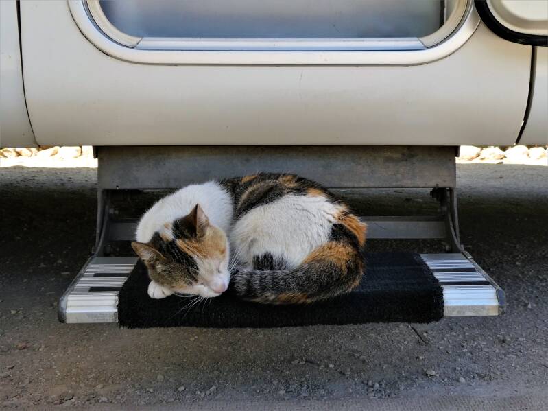 Eén van de twee campingpoezen: deze is helemaal gek van onze camper.