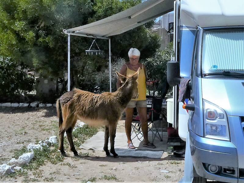 Zo tot een uur of twee vannacht hebben we honden gehoord. Hier op de camping zitten er een vijftal, die een roedel vormen: Indringers worden niet getolereerd. Die roedel honden werkt min of meer samen met een aantal katten hier. Ook zij bewaken hun territorium. Zo zagen we gisteren de katten achter twee verdwaalde puppy's aangaan. Zowel de katten als de honden worden gevoerd door camperaars. Die beesten gaan dus nooit meer weg van deze camping. Vandaag werden we verrast door twee nieuwe bezoekers: ezels. Ook die weten dat er bij de campers wat te halen valt. En krijgen ze niets dan komen ze het wel halen in de camper als ze de kans krijgen. De campingbaas is er niet blij mee want ze vreten ook de beplanting kaal. Hij jaagt ze weg door de hoofdingang, maar vijf minuten later zijn ze terug door een zijdeur.