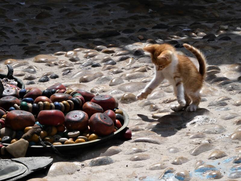 Vervolgens maken we een zwerftocht door het centrum. Door stille steegjes en enorm drukke winkelstraten. Er is werkelijk van alles te koop, maar vooral spullen waar toeristen dol op zijn. En die zijn er veel, ook uit Nederland. Wij kopen nog wat spulletjes voor de kleinkinderen. En een paar stickers van dromedarissen. Frank, uit België, heeft ergens een deukje in zijn camper en om die te camoufleren wil hij er een sticker opplakken. Hij heeft tevergeefs heel Agadir afgezocht. En hier in Essaouira komen wij een stickershop tegen. Ook voor ons zelf hebben we een stickervel gekocht; of we die op gaan plakken weten we nog niet. Maar beter mee verlegen dan om verlegen. Voor een eenvoudige maar voedzame maaltijd hebben we een vast adres hier ergens op een verscholen pleintje met drie restaurantjes. Het is nog weer even zoeken maar we komen op de plaats van bestemming. Onder het eten kunnen we genieten van drie heel jonge katjes die zich uitleven op de souvenirs van een winkeltje. Terug bij de camper hebben we twaalf kilometer gelopen en om vier uur zijn we terug op de camping. Waar we eerst de noodzakelijke de corveewerkzaamheden gaan uitvoeren. De cassette van het toilet moet leeg, er moet water bijgevuld worden, en we rekenen alvast drie nachten af bij Ali de campingbaas. Hoeven we daar morgenvroeg niet meer achteraan en kunnen we zelf bepalen hoe laat we aan de volgende etappe gaan beginnen.