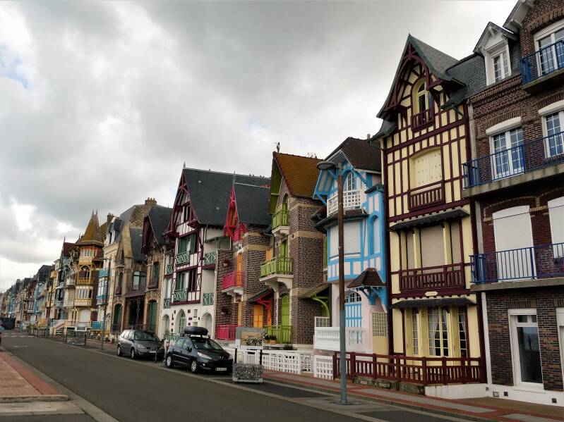 Bij het opstaan is het zwaar bewolkt en het miezert een beetje. We rijden verder langs de kust naar het zuiden, naar Le Treport, een afstand van maar zestig kilometer. We vinden er een leuke plek boven op de krijtrotsen, pal aan zee. We zijn op tijd en dat is maar goed ook: in de loop van de dag loopt alles vol hier met campers. Diep beneden ons ligt in een baai Le Treport. Bereikbaar via een lange trap, maar ook met een soort lift. We beginnen met een wandeling boven langs de rotskust. Zoals overal in deze streek komen we langs een herdenkingsmonument. Ook hier is in de Tweede Wereldoorlog hard gevochten. Voor de tweede wandeling gaan we met de lift naar beneden naar de stad. Le Treport bestaat eigenlijk uit twee delen, gescheiden door een diepe baai. Met name het tweede deel is bijzonder. Langs de boulevard staan enorme hoge huizen met prachtige houten gevels, geschilderd in de meest uiteenlopende kleuren. Hier en daar staat er één te koop, maar dan met wat achterstallig onderhoud. Niets meer voor ons: veel te veel schilderwerk.