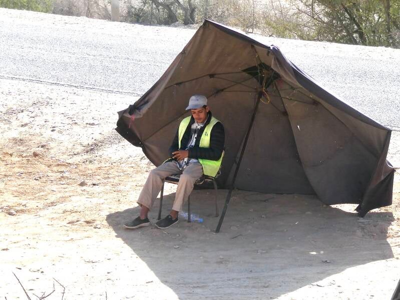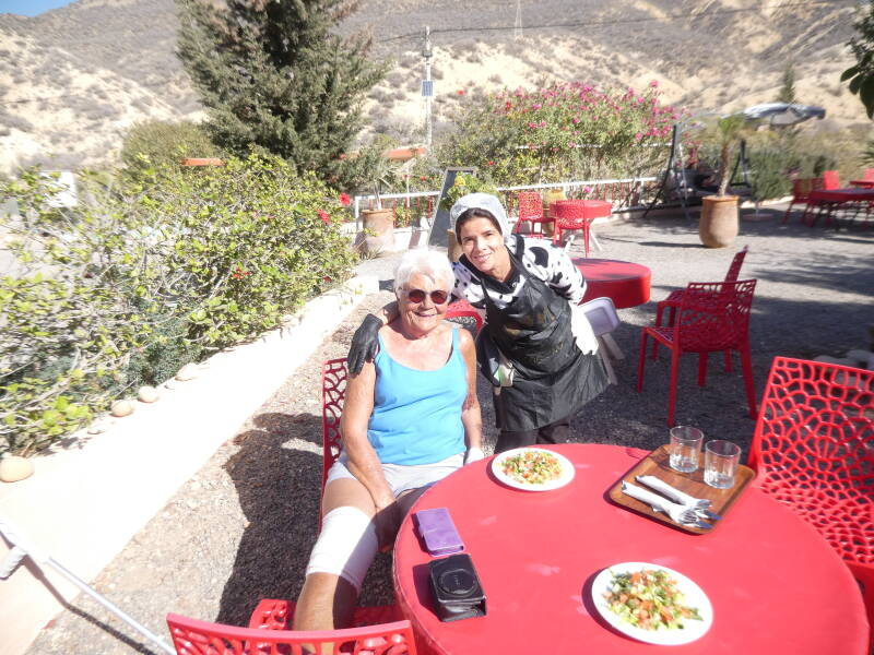 Weer een fraaie dag met heel veel zon: maar ook met heel veel wind. En dat zorgt dan weer voor enorme stofwolken die door de vallei over de camping geblazen worden. De oplossing van de baas van camping hebben we al eens eerder gezien: er wordt een waterwagen met een sproeier het terrein over gereden. De hele regio smacht hier naar water: het doet toch wat wrang aan dat dat kostbare water gebruikt wordt om een camping van stof te ontdoen. In de loop van de ochtend beklimt Wim één van de bergwanden om wat foto’s van de camping en de omgeving te maken. Een half uur steil omhoog en met hele knieën dertig minuten terug de diepte in. En of dat nog niet genoeg beweging is geweest, gaat hij de fiets op om onder in het dorp een bestelling “smoothies avocado” op te halen. Vijf kilometer naar beneden en daarna natuurlijk dezelfde kilometers weer omhoog om op de camping te komen. Gelukkig viel de bestelling in de smaak. Ondertussen is Wobbie druk met het onderhouden van de sociale contacten: daar is ze erg goed in op dit moment. Zowel in het echt als via de sociale media. En zo heeft een ieder zijn kwaliteiten. En nu we het toch over het onderhouden van sociale contacten hebben, willen we Leen en Suus, Henk en Marita (oet Eénter) en Lia en Co bedanken voor hun leuke reacties in het gastenboek.