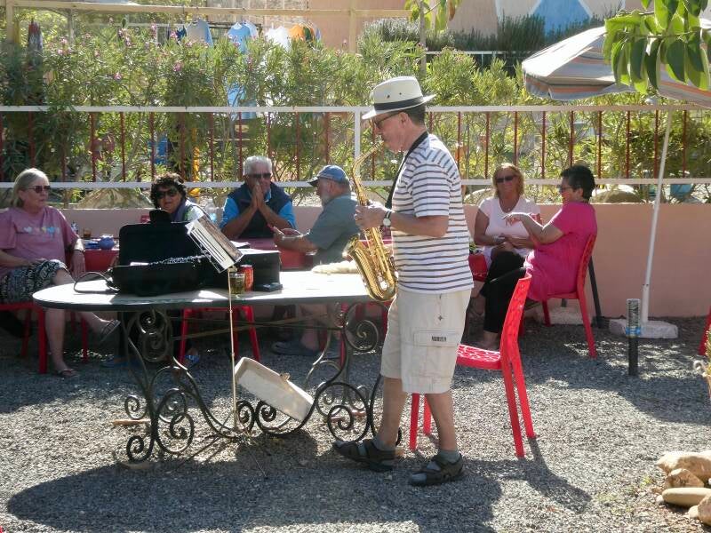 Een dag met twee gezichten. Eerst maar de medische stand van zaken: de hechtingen zitten nog in de knie. De arts vond het nog niet verantwoord om die er vandaag uit te halen. Dat gaat nu a.s. woensdag gebeuren. Het was wel even slikken, maar kennelijk willen wij te snel: de val is nog maar elf dagen geleden. Terug op de camping maakt Wobbie een informatierondje om alle geïnteresseerden van de laatste informatie te voorzien. Het lopen op zich gaat goed, maar is uitermate lastig met een knie die niet kan buigen. Ergens in de middag klinkt er muziek vanaf het terras van het restaurant. En dat nodigt uit om er een kijkje te nemen. De muziek komt van een solomuzikant van onze leeftijd. Voorzien van een computer en een muziekbox. Het bespelen van de saxofoon en klarinet doet hij helemaal zelf. Het is er een gezellige boel, de tafeltjes zijn allemaal bezet en er wordt zelfs gedanst. Voor het muziekgenre zouden wij de radio niet aanzetten, maar op een Marokkaans terras, heerlijk in de zon, met een glaasje verse jus, en met Jan en Pieta er bij, toch wel een bijzondere sfeer. Het hoogtepunt, voor ons, was het nummer “ Tulpen uit Amsterdam”. Speciaal “für die Holländer”; en die zongen alle vier mee, wij ook.