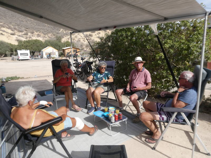 We beginnen de dag rustig. Het is weekend en we hebben geen afspraken of verplichtingen. Behalve één: Margot en Gerard komen vandaag naar de camping. We hebben elkaar al eerder ontmoet hier in Marokko en we volgen elkaar op Polarsteps en de reisverslagen op deze site (koning.jouwweb.nl). We hebben voor hen een aardige plek gereserveerd op deze, al enkele dagen erg drukke camping. Dat reserveren gaat hier overigens simpel. Als er een plek vrij komt, zet je daar zo snel mogelijk twee grote waterflessen en een stoel neer. Daar kraait verder geen haan naar, behalve degenen die na jouw, ook gewapend met twee waterflessen en een stoel, te laat komen. Na de koffie gaan wij met z’n tweeën wandelen; een rondje over het grote campingterrein. Voor Wobbie de eerste keer na de val, dat ze zo ver gelopen heeft. Dat ging erg goed, voor zover dat gaat met een stijve poot: morgen maar weer zo’n rondje. Na de middag komen Gerard en Margot op bezoek: we hebben veel bij te praten. Waarbij we Jan en Pieta ook uitnodigen. En, zoals altijd als het gezellig is, vliegt de tijd en is er een leuke, gezellige middag snel voorbij.