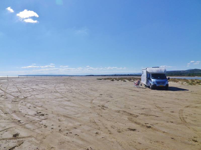 Via via horen we dat het weer aan het einde van de week minder wordt. Dus besluiten we om aan de kust te blijven en te genieten van de voorlopig laatste zonnige dagen. We rijden naar Port la Nouvelle, een badplaats tussen St. Pierre en Leucate. Een mooie camperplaats bij het begin van het dorp. Als je naar de zee wilt, moet je drie kilometer door het dorp en rijdt je maar zo een enorm zandstrand op. En daar mag je tot negen uur 's avonds staan. En heb je genoeg van het strand dan ga je terug naar de camperplek (vier euro per nacht). Op woensdag gaan we eerst naar de markt en daarna naar de Aldi. Tot slot weer naar het strand.