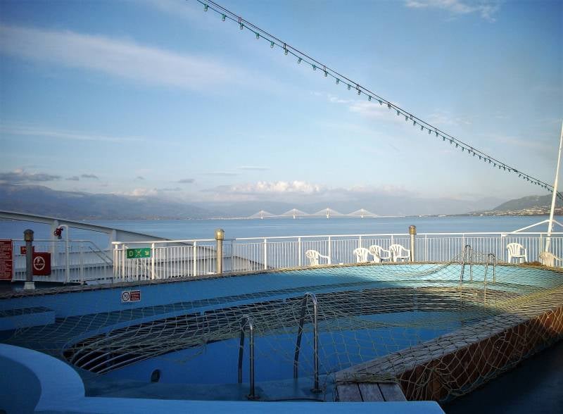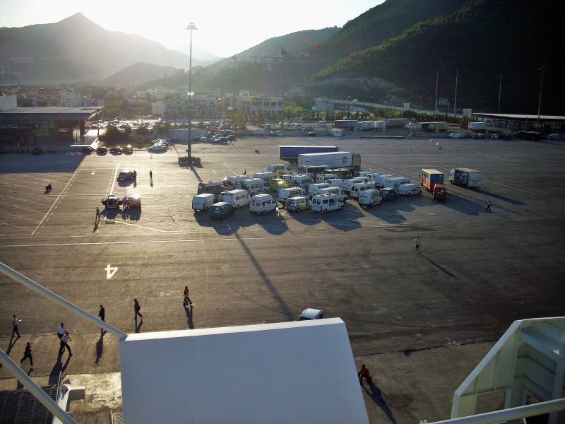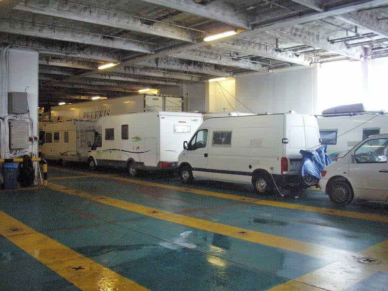 Een spannende dag: we gaan met de boot naar Griekenland. De camper klaar gemaakt, het vuile water eruit, schoon water erin enzovoort. En nog een eind langs het strand gelopen. Om half twaalf vertrekken we naar Ancona en een uur later staan we als tweede camper in de rij voor de veerboot. Een veerboot naast die van ons wordt net vol geladen en daar kijken we met verbazing naar. Nooit geweten dat er zoveel vrachtwagens, auto's en campers in zo'n boot gaan. Om drie uur mogen we zelf onze boot op en we staan langs de deels open zijkant van de boot. Het dek staat gelukkig niet helemaal vol. We hebben zelfs stroom, alleen koken op gas mag officieel niet. De boot telt twaalf verdiepingen. Er zijn winkels, eetgelegenheden in alle soorten en maten, internetmogelijkheden enzovoort. Vlak achter onze camper zijn toiletten en douches. Als alles goed gaat zijn we morgen om twee uur in Patras op de Peleponnesos.