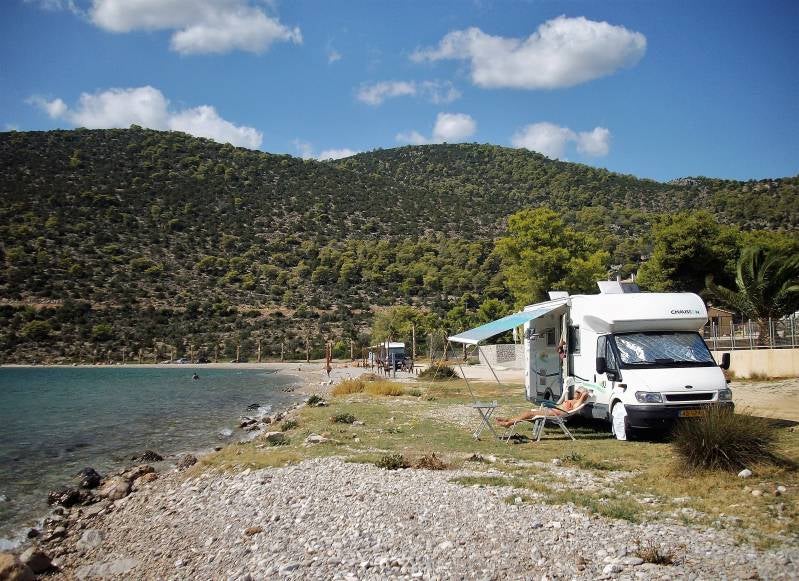 Vanochtend in alle rust gegeten, de camper ingepakt en verzorgd. We rijden vijftig kilometer verder langs de oostkust, naar een dorp met de naam Korvos. Aan het einde van het dorp in de vissershaven zou een camperplaats of gedoogplaats zijn. We vinden het helemaal niks. Dus besluiten we om aan het begin van het dorp te gaan staan bij enkele andere campers. Een soort picknickplaats aan een baai, pal aan het water. Dus in de middag heerlijk gezwommen: volop zon, dertig graden boven water en vijfentwintig in het water.