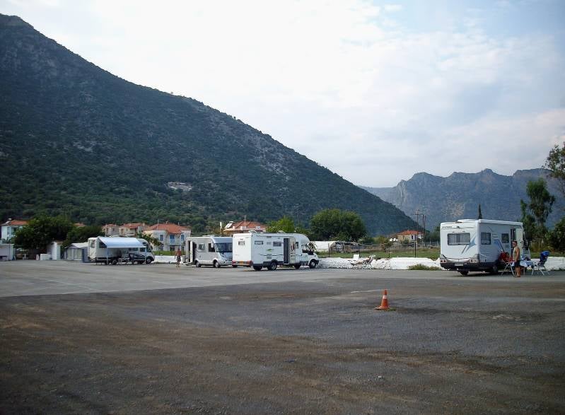 We zijn nog een dag op de camping gebleven, want bij het opstaan scheen de zon weer volop. Dus weer gefietst, gezwommen en gewandeld. Op maandag trekken we verder langs de kust. Over een prima weg tot aan een groot dorp in de buurt van een camperplek. We moeten dwars door het dorp heen, allemaal nauwe straatjes waar onze camper net door kan. En dan moet je geen tegenliggers tegen komen. En die kwamen we dus wel tegen. Maar wij zijn groot en zij zijn klein. Een hoop gedoe en erg spannend. Uiteindelijk komt het allemaal goed. De camperplek, waar we terecht komen, lijkt de enige officiële hier op de Peleponnesos. Een groot terrein met asfalt en alle voorzieningen: en dat kost vijf euro. Morgen gaan we weer verder. Er zijn twee mogelijkheden om weg te komen: weer door het dorp heen of een rit dwars door de bergen.