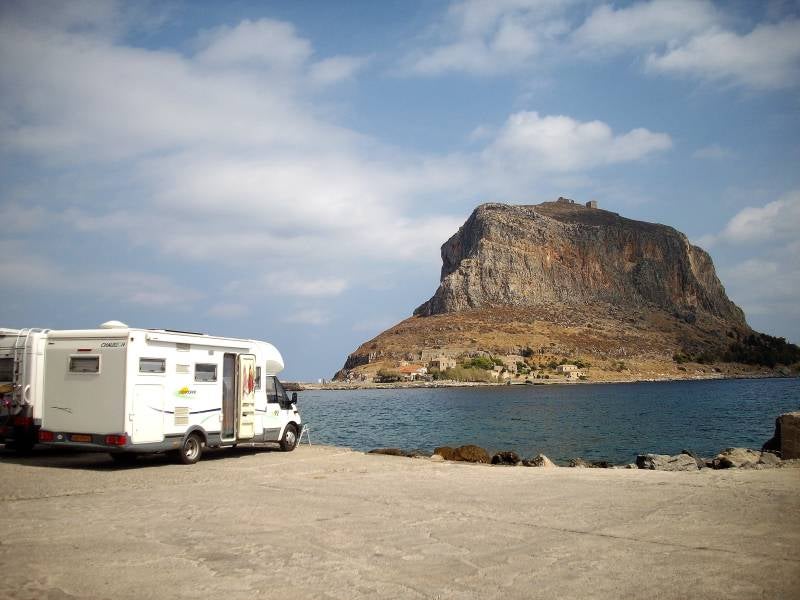 We maken er een spannende rit van: dwars door de bergen. We hadden gehoord dat één dorp problemen kon geven vanwege de smalle weg er door heen. Dat viel uiteindelijk mee, we kwamen geen tegenliggers tegen. Nederlanders op de latere camperplek wel: het uitwijken voor een tegenligger veroorzaakte een crash met een balkonnetje; dus forse schade. Wij vonden het op zich een erg mooie tocht; redelijke wegen, mooie uitkijkjes, hoog en soms stijl. We belanden in de haven van een dorp met de naam Monemvassia. Ervoor ligt een enorme rots in de zee. Daarop een ruïne en een deel met winkeltjes, hotelletjes en restaurants. We staan met twee andere campers in de haven. Een gedoogsituatie, zoals eigenlijk overal hier.