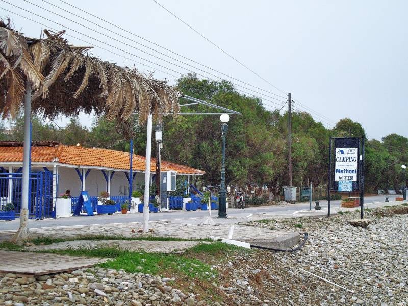 We dachten een klein stukje verder te rijden want we hadden volgens onze gegevens een aardige camperplek uitgezocht. Bleek helemaal niks te zijn, en de plekken daarna ook al niet. Wel veel campings onderweg en dat betekent weinig vrije camperplekken. We zitten intussen onderin de laatste vinger van de Pelponnesos, aan de westkust. Hier kom je nog wat toeristen tegen. In een dorp met de naam Methoni gaan we aan het strand staan. Als we om de camper heen lopen blijken we pal voor een bord te staan met "No Camping". We belanden daarna op de gemeentecamping. Die is officieel gesloten, maar de poort is open en je kunt er zo maar gaan staan, Alles doet het nog, stroom, warm water, douches enzovoort. En dat allemaal voor niks: dat kunnen we niet laten lopen. Je kunt nog wel wat drinken bij de ingang en dat doen we natuurlijk. Het weer is bewolkt, droog en het is erg warm.