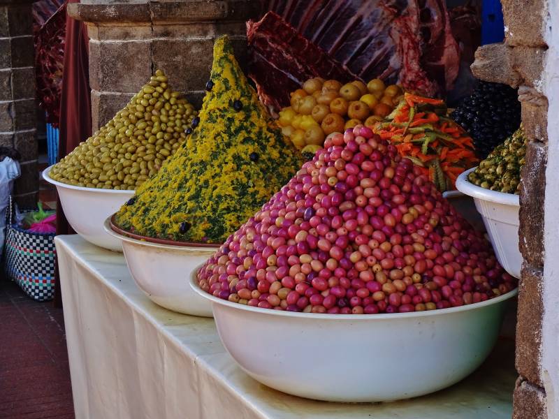 Vandaag, zaterdag, het laatste grote stuk Spanje: van Caseres naar de havenplaats Algeciras. We overnachten op een grote parkeerplaats van een aantal supermarkten, samen met veel andere, vooral Franse campers. We doen boodschappen bij de Lidl en kopen tickets voor de overtocht morgen. Nu € 220 voor een retour, twintig euro duurder dan vorig jaar, met nog steeds een cake en een fles wijn. En we eten bij McDonalds, met eindelijk goede koffie en gratis Wifi. Op zondagmorgen zijn we vroeg wakker en al om acht uur bij de haven, waar we pas om negen uur het terrein op kunnen. Op de boot is het erg rustig en we vertrekken al om kwart over elf. Het weer is prachtig en het uitzicht daarmee ook. Tegen twaalf uur zijn we in Marokko, in de haven van Tanger Med. En een uur later rijden we weer, voorzien van de goede documenten, stempels, Marokkaans geld enzovoort. Na vijfentachtig kilometer stoppen we in de plaats Asilah, pal aan zee. We staan voor vier euro op een parkeerplaats met nog acht andere campers. In Asilah is het druk met vooral families in zondagse kleren. En zondag of niet, alle winkeltjes zijn open en in de straten wordt van alles verhandeld: groente, fruit, kleren, pinda's enzovoort.