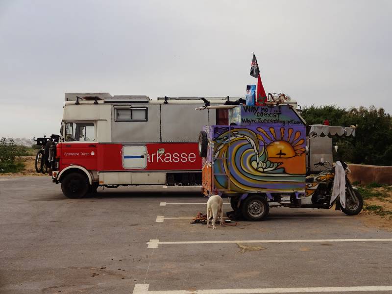 Als we opstaan hebben we twee nieuwe buren met wel erg bijzonder campers (zie foto). Als we uitgekeken zijn, wandelen we eerst naar een gloednieuwe supermarkt van Carrefour. Groot, mooi en nog erg rustig. Essaouira moet kennelijk nog wennen aan een supermarkt. Na de boodschappen rijden we een stukje naar het zuiden, naar de camping in het gehucht Sidi Kaouki. Het waait er hard, het is er zwaar bewolkt en het miezert zelfs even. We maken een pittige wandeling en drinken koffie op een soort dorpspleintje. Mensen zijn er amper, des te meer honden en katten, in alle soorten en maten.