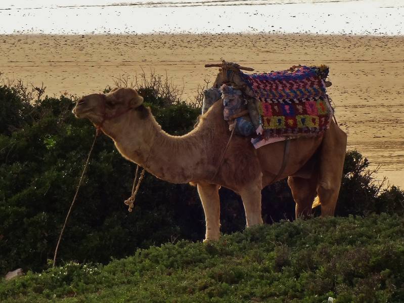 Op zondag schijnt de zon weer volop, alleen raast er een harde wind over de camping. We rommelen wat en kletsen wat met andere Nederlanders. Vooral de ontvangst van de Nederlandse televisiezenders is een hot item. Wij hebben nog ontvangst, anderen niet hier. En waar dat aan ligt? Niemand die het precies weet, maar het houd je van de straat en aan de praat. Gisteren zijn we rechts het strand langs gelopen, vandaag gaan we dus linksaf. We zijn de enigen, op wat geiten, schapen, koeien, ezels en dromedarissen na. Oh ja, en een mevrouw van een koffietentje.