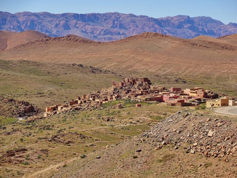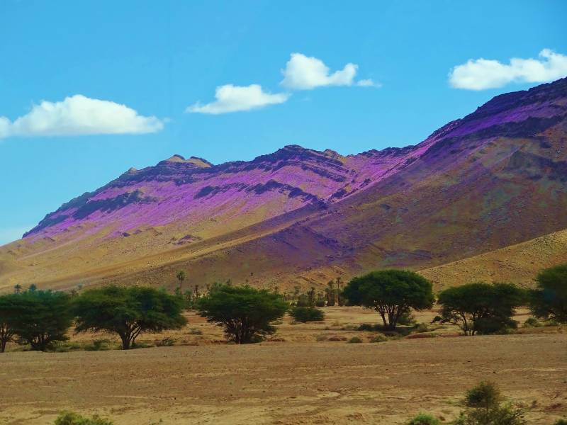 We gaan verder het binnenland in: van west (de kust) naar oost (richting woestijn). Op onze wegenkaarten wordt er een rode weg aangegeven, de N12, die het meest logisch en berijdbaar lijkt. Via Guelmim, waar we boodschappen doen bij een gloednieuwe Marjane, komen we terecht in een kaal landschap met mooie doortekende heuvels. Volgens onze kaart heet het "Ani Atlas" hier. De weg is smal, maar goed berijdbaar. We stoppen in het dorp Icht, op een vakantiecomplex annex camping. Van Franse eigenaren, mooi aangelegd en dito sanitair. Het dorp zelf is niet bijzonder, de omgeving kaal en ruig. Meer een omgeving voor 4x4 campers en auto's. Op vrijdag trekken we verder langs de Algerijnse grens. We hebben de wat grotere plaats Tata als eindbestemming. De tweede helft van het traject gaat over een nieuw geasfalteerde weg: breed, vlak en rijdt heerlijk. Het landschap is onveranderd kaal en ruig en vrijwel verlaten. In de buurt van Tata kleuren plotseling een aantal heuvels om ons heen paars van kleur. Een explosie van bloemen. Prachtig om te zien. Het vinden van een plek in Tata is nog een hele toer. We hebben twee campings op het oog. De eerste, midden in het dorp, is afgeladen vol. Daar willen we zo wie zo niet staan. De tweede camping, zeven kilometer buiten het centrum, en van een Nederlander is er niet meer. Op wat vervallen gebouwtjes na, lijkt het in niets meer op een camping. We gaan terug naar Tata en komen min of meer bij toeval terecht op een hotelcomplex met camping, drie kilometer buiten het stadje: Oasis Dar Ouanou. We vinden er nog een mooie plek: om ons heen palmbomen en paarse heuvels.