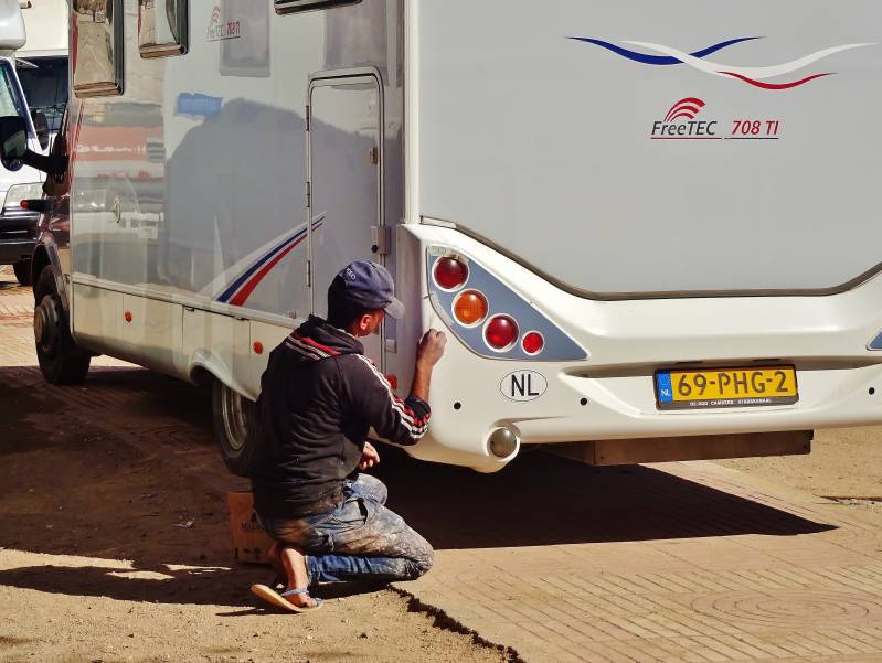 Op vrijdagmorgen moet de camper dus naar de garage. We zijn nu één van de dertien. Om klokslag tien uur wordt er begonnen aan onze camper. Wij gaan het dorp in. Wat boodschappen doen, koffie drinken, what's appen, eten enzovoort. Om twee uur mag de camper weer mee. Voor vijfendertig euro zijn alle beschadigingen weggewerkt en is de bumper overgespoten. Aan het einde van de middag gaan we douchen bij Omar van Camping Granite Rose. Vier jaar geleden hebben we daar tijdens de Vagebondreis gestaan. Douchen daar is geen probleem, Omar is gek op Dirhams, douchen kost een euro per persoon. Terug bij de camper staan er vier buurmannen aandachtig onze overgespoten bumper te bestuderen. Eén van hen, een Belg die twee talen spreekt, vindt dat de bumper nog verder afgewerkt moet worden. De man van de garage wordt erbij gehaald, hij stond toevallig een paar campers verder, en krijgt in keurig Frans te horen dat de bumper nog niet af is. Is geen probleem, we moeten maandag nog een keer langs komen. Best handig als je goed Frans spreekt hier.