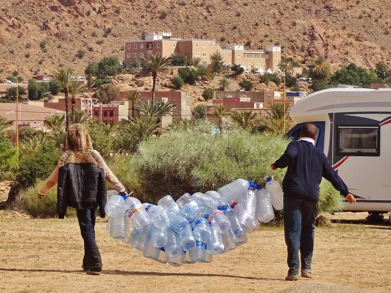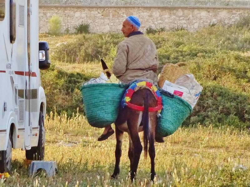 Op zondagmorgen gaan we weer het dorp in. Wat boodschapjes, koffie drinken, what's appen en slippers kopen. Voor de kleinkinderen, we hebben een lijstje met de goede maten. Voor de meiden is dat geen probleem, kleuren en maten zijn ruim voor handen. En omdat we vier paar nodig hebben, kun je onderhandelen over de prijs. Zoiets als vier halen en drie betalen. Voor een jongen is het wat lastiger een paar leuke slippers te vinden. En dus ook veel duurder, zeker één euro vijftig. 's Middags luieren we onder de luifel en krijgen we regelmatig bezoek van mannetjes die van alles willen verkopen. Om er een paar te noemen: argaanolie, truffels, honing, vers water, wasgoedservice, brood, gebak en een mevrouw die heerlijke haririsoep verkoopt. Volgens een buurman is het hari-kiri soep. Allemaal even aardig en als je iets niet wilt geef je dat duidelijk aan en dan is het goed. Behalve een verkoper van ruitenwissers voor de camper. Die komt twee keer per dag langs en blijft zeuren. Hij heeft ontdekt dat in één van onze wissers een scheurtje zit en hij heeft volgens ons het kenteken genoteerd en blijft dus terugkomen en zeuren. Ach ja, zo is er overal wat.