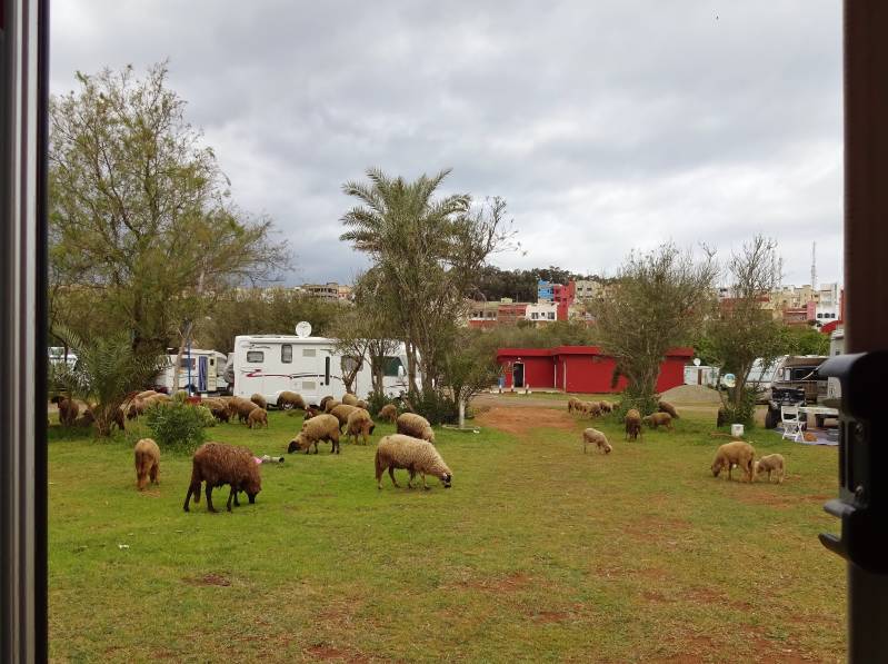 We gaan naar de laatste camping in Marokko voor dit jaar, naar Moulay Bousselham. Het mooie weer is op, dus we gaan naar Europa. Vanochtend was het nog droog, maar vanmiddag, op de camping, kregen we regelmatig een bui over ons heen. Het is erg druk hier op de camping, kennelijk zijn wij niet de enigen die morgen terug gaan. Wie zeker niet terug gaan zijn de schapen, die ook nu weer op bezoek komen. Het blijft een wonderlijk schouwspel, een kudde schapen die tussen de campers lopen te scharrelen. En we komen Hans en Amy weer tegen (van Camping River in Frankrijk): ook zij zijn met de terugreis bezig. Aan het einde van de middag hebben we met een borrel afscheid genomen. Natuurlijk was dat weer erg gezellig. Morgen de boot op !