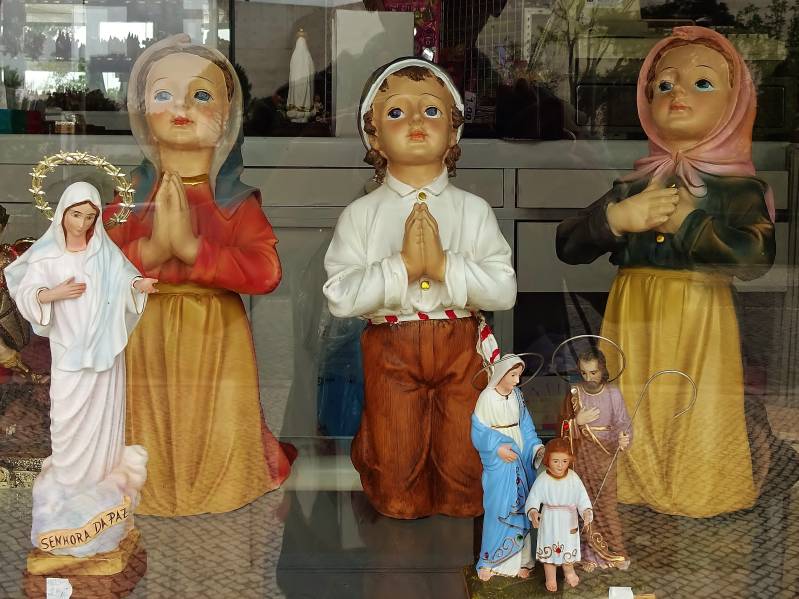 Weer verder naar het noorden. Tegen het weekend moeten we in de buurt van de plaats Coimbra zijn. Daar ergens in de buurt vindt een reünie plaats met twee oud-collega's van Wobbie. De één heeft een camping in Portugal, de ander is op zoek naar een huis hier. Vandaag komen we terecht in het dorp Vila Nova de Barquintha, aan de rivier de Taag en ergens tussen Lissabon en Coimbra. Een wonderlijk dorp met een enorm park langs de rivier. Mooi aangelegd en vol met moderne kunst en een plek waar campers mogen staan. Het dorp zelf staat al jaren voor de helft leeg en maakt een trieste indruk. En het weer werkt ook al niet mee. Als we aankomen begint het te regenen en dat duurt tot het einde van de middag. Maar we hebben een hele goede internetverbinding hier. Tot negen uur. Dan gaat er kennelijk ergens iemand naar huis en trekt de stekker er uit. Na een eenzame nacht met nog één andere camper, reizen we in de mist verder, weer naar de kust. Onderweg komen we langs Fatima, een beroemd bedevaartsoord vergelijkbaar met Lourdes. Daar gaan we kijken. Het verhaal luidt als volgt. In 1917 verschijnt Maria in een eikenboom aan drie kinderen. En dat gedurende een half jaar vrijwel dagelijks. Op die plek staat nu een enorme kerk met graven van de kinderen, meerdere kapellen en een enorm plein. Nog groter dan in Rome. En enorme parkeerplaatsen voor auto's en een aantal campers. En uiteraard de hele dag door missen en elke avond een processie. Het is er rustig nu, het parkeren van de camper is geen enkel probleem. Helaas wordt het gigantische bordes voor de kerk gerestaureerd en die is daardoor gesloten. Over mooi of niet mooi valt te twisten, maar indrukwekkend door de enorme afmetingen, is het zeker. Ook hier bedevaartgangers die het laatste stuk op de knieën afleggen, soms met en soms zonder kniebeschermers. Wel allemaal met een duidelijke zichtbare rozenkrans. De plaats zelf is vergelijkbaar met Lourdes, talloze winkels met souvenirs. Maria in alle soorten en maten, en prijzen, en uiteraard heel veel beelden van drie geknielde kinderen. Na een paar uur ronddwalen hebben we genoeg inspiratie opgedaan en gaan weer verder. Uiteindelijk stoppen we in het dorp Pedrogao, pal aan zee, en parkeren de camper keurig in een rij van zo'n zeven anderen. Het vakantiedorp maakt nog een verlaten indruk. En alles ligt vol zand, kennelijk door de najaar- en winterstormen over het strand het dorp in geblazen. Of dat nog opgeruimd wordt voor de start van het vakantieseizoen betwijfelen we. Zoals de afgelopen dagen komt de zon in de loop van de middag weer te voorschijn. De wind blijft echter fris.