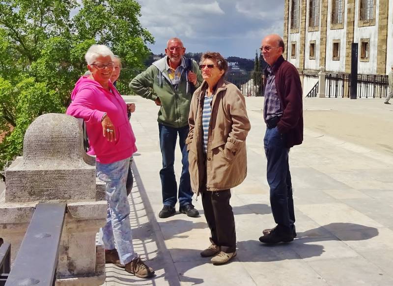 De zaterdag is gereserveerd voor een reünie. Met Petra en Rob gaan we naar Coimbra en daar ontmoeten we Jikke en Sietse. Jikke, Petra en Wobbie hebben alle drie in Emmen gewerkt, in de zorg bij dezelfde mevrouw. Daarnaast hebben Jikke en Sietse een camping hier in de buurt. We hebben koffie gedronken, een wandeling door Coimbra gemaakt en tot slot met z'n allen gegeten. Erg gezellig uiteraard en een leuke afsluiting van ons bedrijf in Portugal. Want op zondag beginnen we echt aan de terugreis. We trekken dwars door het midden van Portugal, langs de Siera Estrela, naar de grens met Spanje. Een mooie route en een zonnige dag. Alleen in de laatste kilometers zitten een paar spannende dorpen. Kennelijk een grapje van onze TomTom. We stoppen vlak voor de grens met Spanje, in het grensdorp Vilar Formoso. Op een camperplek van een enorme winkel van Sinkel, waar zelfs bussen stoppen vol mensen uit de weide omgeving die een dagje uit zijn.