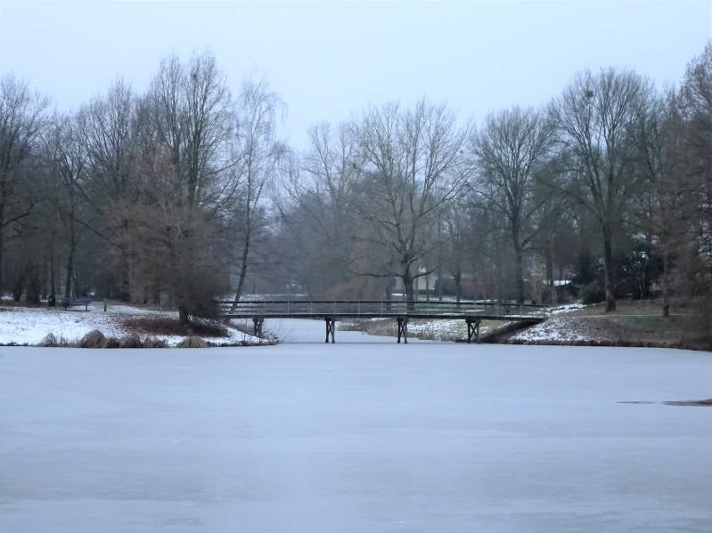 Een spannende dag: we gaan weer op reis na twee maanden in Apeldoorn te zijn geweest. En die twee maanden zijn omgevlogen. Op onze manier zijn we heel erg druk geweest. Verjaardagen, Sinterklaas, Kerst, Oud en Nieuw, naar vrienden toe, vrienden ontvangen enzovoort. En de kleinkinderen natuurlijk: oppassen, naar de Efteling, de dierentuin, zwemmen, schaatsen, kerstshows en naar 'Kinderen voor Kinderen". Hoog tijd om weer een beetje bij te komen. De dag begint koud. In het Mheenpark ligt sneeuw en een laag ijs op de vijvers (zie foto). En, nog erger, met het nieuws dat er ergens in Amsterdam een stroomstoring is. En dat er vanaf Utrecht vrijwel geen treinverkeer mogelijk is. En in de rest van het land is het uiterst onzeker of en wanner je op de plaats van bestemming komt. En wij moeten via Utrecht naar Eindhoven, waar we om half acht de lucht in gaan. Na een hoop gedoe besluiten we om vroeg te vertrekken en via Zutphen en Arnhem te reizen. Om een lang verhaal kort te maken, om half drie gaan we de deur uit en om zes uur zijn we op het vliegveld. Om acht uur zijn we in de lucht en om half tien, Portugese tijd, zijn we in Faro. De taxi, André van Camperstop Messines, staat daar al op ons te wachten. Om half elf zijn we terug bij de camper. We worden door André gewaarschuwd om de kachel aan te laten: het vriest hier 's nachts!