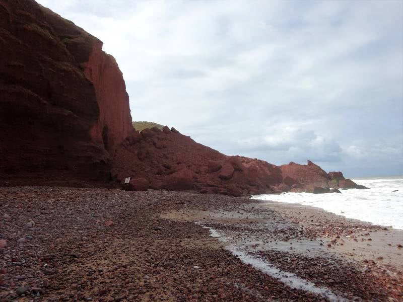 Voorlopig is het nog droog als we gaan rijden. Op naar de kustplaats Sidi Ifni via een mooie route door een groen landschap. Een paar kilometer voor Sidi Ifni ligt hoog boven de zee een bungalowpark en beneden, bij het strand, een aantal restaurantjes. Dat alles heet Legzira. Waar het vooral om gaat, of ging, waren twee natuurlijke bogen die uitlopen in de zee en waar je onderdoor over het strand kon lopen. Vorig jaar oktober is de tweede boog ingestort. En dat willen we zien natuurlijk, we zijn er nu toch. Een enorme massa roodbruin grind en zand verraad de plek des onheils en blokkeert een verder strandwandeling. Een groot deel van de charme van deze plek lijkt voorgoed verdwenen. In Sidi Ifni kiezen we weer voor camping Gran Canaria. Rondom de camping wordt nog volop gewerkt aan nieuwe wegen en afwateringsystemen. Alles nog het gevolg van de overstromingen in 2015. Eigenlijk is het nog steeds een puinhoop. En tot onze schrik is de camping zo goed als vol met bijna enkel Franse camperaars. Met wat moeite vinden we nog een plekje ergens tussen. Niet geweldig, maar we doen het er maar mee. Na wat gemiezer in de middag gaan we nog even de stad in. En kopen weer een opwaardeertegoed voor de telefoon. En dat opwaarderen moeten we zelf doen; de mevrouw in de winkel begint er niet aan. Terug in de camper gaan we dat zelf doen. En natuurlijk lukt dat weer niet.