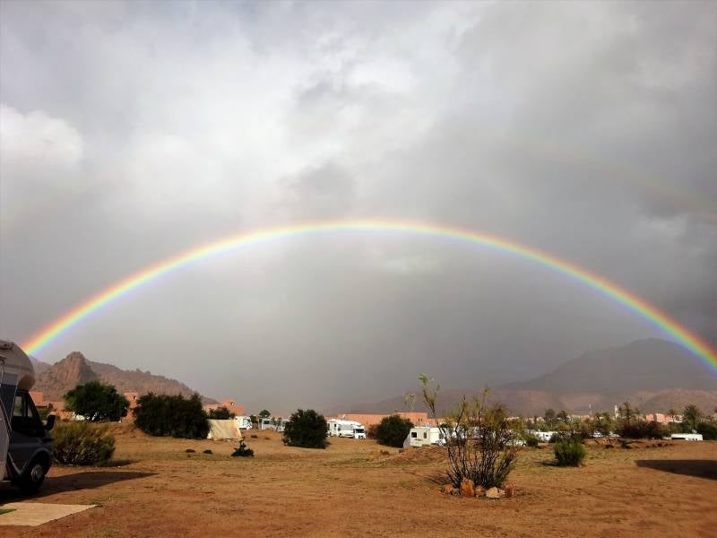 Op zondag gaan we naar Tafraout, in het binnenland. Daar hebben we vorig jaar meer dan drie weken gestaan en vinden het er geweldig. Dat we er nu al heen gaan heeft een reden. Van kennissen hebben we het adres van een tandarts in Tafraout gekregen, en daar willen we morgen naar toe. Als we Sidi Ifni uitrijden worden we aangehouden door een politieagent. We hebben een stopbord genegeerd. En inderdaad staat tien meter terug een stopbord dat een functie had van voor de wegomleiding nu. Hij laat een Arabisch formulier zien waar ergens 700 dirham (circa 65 euro) op staat. Maar omdat wij het zijn of omdat het zondag is of om nog een andere reden, kost het nu maar 400 dirham. Inmiddels heeft de man al onze documenten al en wij geven 400 dirham. En wij willen een kopie van de Arabische bon, met ook zijn naam daarop. Waarop hij vraagt of wij Arabisch spreken. Wij niet, maar we kennen iemand die dat wel kan en daar gaan we nu net naar toe: we verzinnen het ter plekke. De man schrikt zichtbaar en roept dat we een waarschuwing krijgen omdat we voor het eerst in Marokko zijn. Eén voor één krijgen we alle documenten en bankbiljetten terug. Er worden geen handen geschud bij het afscheid. De verdere reis verloopt gelukkig zonder problemen. In Aglou-Plage drinken we koffie en op de "Col de Kardous" (erg hoog) eten we een broodje tussen de middag. Tot die hoge berg is het wisselend bewolkt en zien we regelmatig de zon. Eenmaal de berg over is de zon verdwenen en krijgen we regelmatig een regenbui over ons heen. Tegen half vier zijn we in Tafraout, in het keteldal. En komen uiteraard terecht in de "Nederlandse hoek". Er staan veel bekenden hier: Kees en Dinie, van de Fiat 500, Dik en Nanda, uit Deventer, Elly en Piet, van de website "toesjoeranroet", en Joske en partner, van het Camperforum. Tegen zes uur begint het te regenen, en niet zo zuinig ook: welkom in Tafraout! Morgen maar verder met de begroetingsronde.
