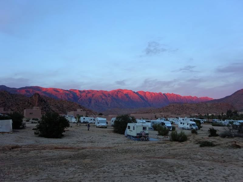 Als we wakker worden is het zwaar bewolkt en volgens de weersvoorspellingen komt er nog regen ook vandaag. We gaan maar weer rijden. Deze keer honderdvijftig kilometer naar het dorp Aourir, even voor Agadir. De route, zo dicht mogelijk langs de kust, kennen we en is afwisselend en mooi. De weg zelf is smal, de gemiddelde snelheid komt niet boven de zestig kilometer per uur. Tot het surfdorp Taghazoute: daar omheen ligt nu een prachtige vierbaansweg. De mensen van de camping in Aourir kennen ons nog van de voorgaande jaren. We worden weer hartelijk welkom geheten. De camping zelf is goed bezet. Ook de Belgische wandelvrienden van Wobbie, Frank en Ria, zijn er. Nu nog mooi weer, dan is het helemaal goed. Of nee, toch niet helemaal want het internet is hier waardeloos. Maroc Telecom werkt hier niet (meer) en voor de wifi van de camping moet je bijna op de schoot van de beheerder zitten bij de receptie. De voorspelde regen komt aan het einde van de middag. Tot laat in de avond gaat het behoorlijk te keer. En uitgerekend morgen is er de wekelijkse grote markt in Aourir. Op een zandvlakte, en wij hebben groente nodig.