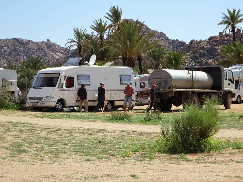 Voor we wegrijden laten we eerst de camper wassen. Een nieuwe service van de camping en dat kost vijf euro. Eerst een hogedrukspuit, daarna een handborstel en shampoo, afspuiten en tot slot met de hand droogzemen. De man die het voor ons doet is er bijna een uur mee bezig en het resultaat is er naar. Daarna op weg naar de wat grotere plaats Tiznit. De camping in het centrum is "complet", daar hadden we al op gerekend. We denken een camping te weten zo'n zes kilometer buiten Tiznit. Als we daar aankomen ziet die er heel anders uit dan wij in gedachten hadden. We hebben geen zin om verder te rijden en zoeken een plek. Het is een prachtig aangelegde camping, Camping Tazerzite, met erg mooie voorzieningen: een beetje on-Marokkaans. Het grote nadeel is echter de ligging, midden in een niemandsland. En van de weg naar Tiznit, slechts zes kilometer verder, zijn de eerste vier levensgevaarlijk op de fiets. Een razend drukke, vrij smalle vierbaansweg. En men is hier kennelijk niet gewend aan fietsers; er wordt wat afgetoeterd. En hoe leuk Tiznit ook is, met de fiets vanuit deze camping niet te doen. Op vrijdagmorgen dus maar weer verder naar het zuiden. De weersvoorspellingen houden niet over voor de komende drie dagen. Vooral in het weekend wordt er veel regen verwacht. Hopelijk valt dat dieper in het zuiden wat mee.