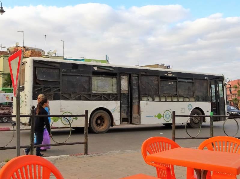 Als we opstaan op dinsdagmorgen is het zwaar bewolkt. We besluiten min of meer spontaan om te vertrekken. Gaan de tolweg op en stomen op naar het noorden. Uiteindelijk stoppen we in de grote kustplaats Kenitra. We staan op een soort stadscamping met de welluidende naam "Complexe Touristique La Chenaie". Het voordeel van deze camping is dat je zo maar in het gezellige centrum bent. En dat is één grote open lucht souk. Erg druk, levendig en weinig toeristen. Erg opvallend hier zijn de vele stadsbussen. Niet meer de modernste, maar bijna allemaal met in plaats van ramen aan de trottoir- en achterkant, zware houten schotten. Het ziet er niet uit en wij vermoeden de gevolgen van een fors uit de hand gelopen demonstratie. Hoe leuk het centrum van Kenitra ook is, des te triester wordt je van de camping. Overvol, chaotisch en slecht sanitair. Zowel bij de dames als de heren is er één warme douche (voor tien dirham). De overige douches zijn koud en je staat met je voeten in zo'n Franse mikput cq hurktoilet. Morgen gaan we verder.