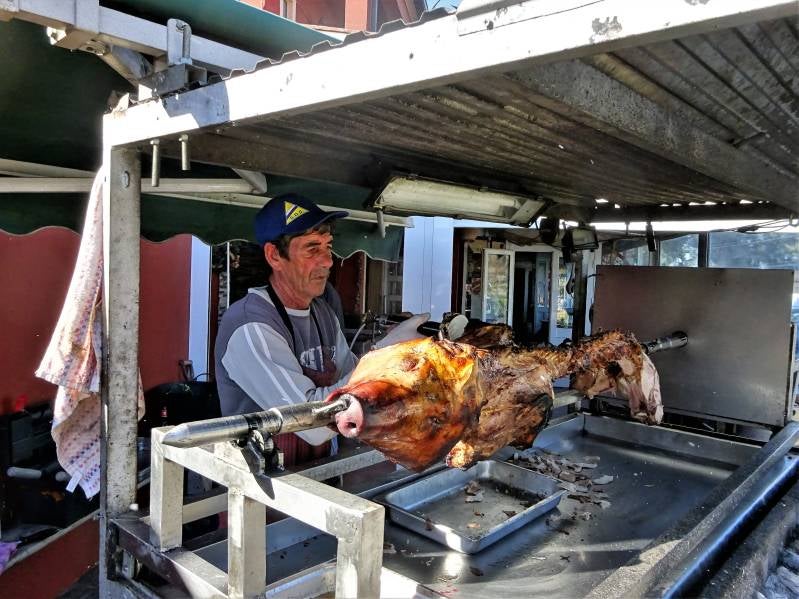 We beginnen de dag dus met een ritje naar de garage. De camper start zonder problemen en in de garage blijkt dat na de rit van dertig kilometer de accu's helemaal vol zitten. Vervolgens rijden we verder naar de kust, naar Falesia. Een poging om daar een afspraak te maken met de "vaste pedicure" van Wobbie, mislukt. De agenda van de mevrouw zit deze week helemaal vol. We zoeken een parkeerplaats op aan zee, bij een nu gesloten strandtent. En daar, bij Praia Dos Tomates, staan nog twintig andere campers, gewoon "in het wild". Wij maken een flinke wandeling langs de prachtige kust. En omdat we er toch zijn en het wel vijfentwintig graden is in de zon, eten we buiten. De één na laatste stop vandaag is bij de Lidl en Aldi in Albufeira. We moeten hamsteren voor de reis naar Marokko, en dan met name zaken die daar moeilijk te krijgen zijn. Deze keer gaan we voor varkensvlees: spek, worst, gehakt en wat niet al. Terug bij de camper wordt alles "her-verpakt" en gaat de diepvries in. Nu de drank nog, maar die halen we in Spanje. Op vrijdagmorgen eerst een pittige wandeling. Hoog op een bergkam, bij het gehucht Pico Alte, staan drie windturbines, van waaruit je een prachtig uitzicht hebt over de omgeving. De weg erheen is vijf kilometer klimmen en erg pittig. Maar het uitzicht maakt alles goed, vooral omdat de lucht erg helder is. De route terug verzinnen we zelf. En die gaat via een drooggevallen sloot, een kilometer stijl naar beneden: een avontuur op zich. Terug bij de camper hebben we geen tijd om bij te komen. We willen uit eten en dat moet hier tussen één en drie uur. We gaan op de fiets naar het gehucht Campilhos, het restaurant heet "O Petisco", waar we al vaker geweest zijn. Op vrijdagmiddag zitten daar de drie eetzalen vol, want dan staat er speenvarken aan het spit op het menu. Die wordt buiten naast de voordeur klaargemaakt op een soort giga-barbeque. De hele omgeving ruikt naar gegrild speenvarken. Binnen worden alle tafels voorzien van een schaal vlees. Aangevuld met een soort bonen in tomatensaus en een bak chips. We hebben heerlijk gegeten. Terug bij de camper kunnen we nog even uitblazen in de zon. Die gaat hier om een uur of vijf onder, waarna iedereen in de camper verdwijnt.