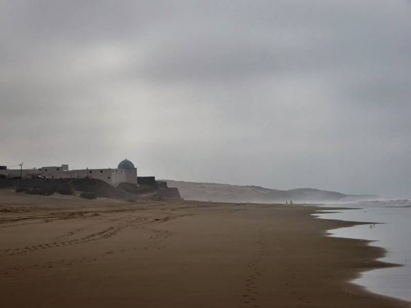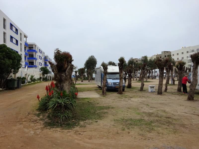 We krijgen een bewolkte dag voor de kiezen. Bovendien is het bij het opstaan erg fris; pas in de loop van de middag halen we de achttien graden. We gaan vroeg rijden en gaan op zoek naar een camping. Via de tolweg zakken we snel verder naar het zuiden. Onderweg is Wobbie druk met het zoeken naar een aardige camping. We komen echter niet veel beters tegen dan L 'Ocean Bleu in Mohammedia, een grote plaats tussen Rabat en Casablanca. We zijn er al vaker geweest en voor in de middag rijden we er binnen. De camping is nu helemaal verscholen tussen hoge appartementencomplexen, die nog voor een groot deel onbewoond zijn. Niet echt een vrolijke plek meer, zeker nu niet onder een dik wolkendek. We hebben geen tijd om te kniezen, er moet gewerkt worden. Vuil water uit de camper, schoon water er in, de cassette van het toilet moet leeg enzovoort. Maar bovenal moet de camper gewassen worden van Wobbie. Na anderhalf uur is de klus geklaard en is al het Portugese vuil verdwenen. Om bij te komen maken we nog een ommetje langs het strand en daarna lekker onder de douche.