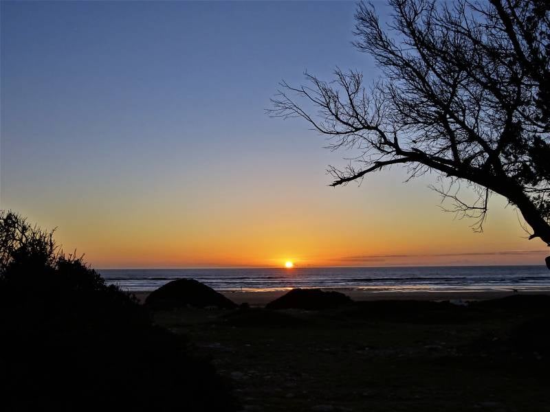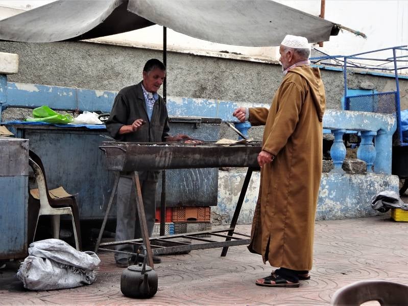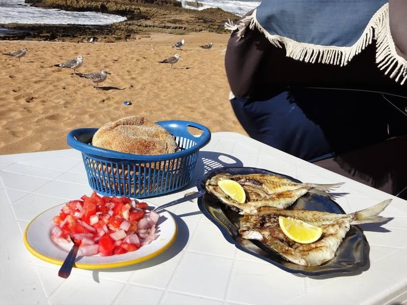 We hebben een rustdag vandaag. Van de camping gaan we naar de "camper-parking" beneden bij de zee, bijna vier kilometer terug. Omdat we vroeg zijn pikken we een prachtige plek in: uit de wind en in de zon. We staan nog maar amper of we komen Ali de tajinekoerier al tegen. We bestellen er gelijk maar één voor vanavond. Behalve het bezorgen van tajines is Ali ook gek op fietsen, kleding, schoenen en telefoons. En hij is niet de enige. Om de haverklap komt er iemand langs. De meesten overigens met een brommer met een plastic bak achterop. Met daarin wat er hier uit de zee gehaald wordt, en dat zijn vooral schelpdieren. En die zijn aan ons niet besteed. Na een pittige wandeling gaan we naar het strand om er een visje te eten. Die mag je zelf uitzoeken en worden ter plekke schoongemaakt en gegrild. Brood er bij en een schaaltje Marokkaanse salade maken de maaltijd compleet. Bij die salade, tomaten en uien, zitten twee lepeltjes. De rest eet je met je vingers. Om ons heen worden die vingers afgeveegd aan de broek; gelukkig heeft Wobbie een zakdoekje bij zich. Dat wat er over blijft van de vis, dorado's, is voor de meeuwen die ongeduldig zitten te wachten tot we uitgegeten zijn. De rest van de middag komen we bij in de zon. Zo tot een uur of zes, dan gaat hij onder. En dan staat Ali met de tajine voor de camperdeur.