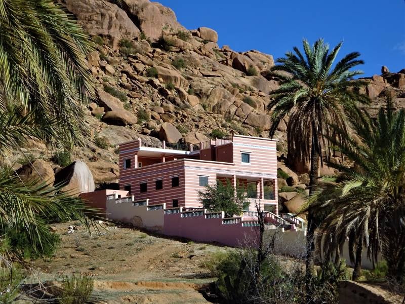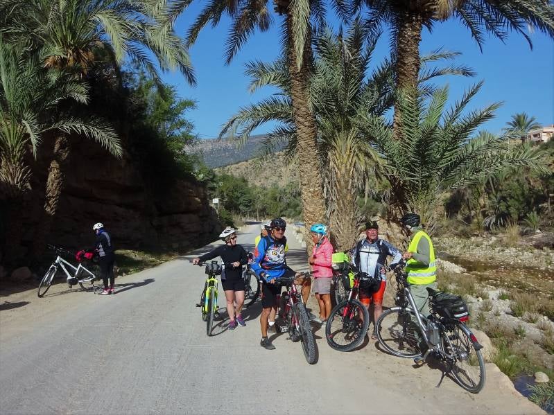 Op vrijdagmorgen volgt deel twee van de bejaardengymnastiek: een fietstocht. Vijf Fransen, twee Belgen en twee Nederlanders deze keer. Op één mountainbike na, zijn de anderen elektrisch aangedreven. Vooral de fietsen van vier Fransen vallen op: elektrische mountainbikes, ware racemonsters. De route is prachtig, via het dorp Alma belanden we uiteindelijk in de "Vallée du Paradis", een kloof na een enorme afdaling. Deel twee van de route, min of meer door dezelfde kloof, gaat op en af. Voor de vier racemonsters geen probleem, wij hebben er meer moeite mee. Na vijfendertig kilometer zijn we terug bij de camper: een beetje moe maar voldaan. Aan het einde van de middag fietsen we nog een keer naar Aourir: we hebben postzegels nodig. Die koop je bij het kantoor van Poste Maroc. Er zijn een stuk of acht wachtenden voor ons, allemaal mensen die geld op komen halen. Zoals dat vroeger ook bij ons ging: aan een loket met formuliertjes, een langdradig gedoe. Een bewaker regelt de volgorde met strenge hand. En die man helpt ons uiteindelijk aan vier postzegels.