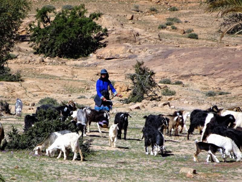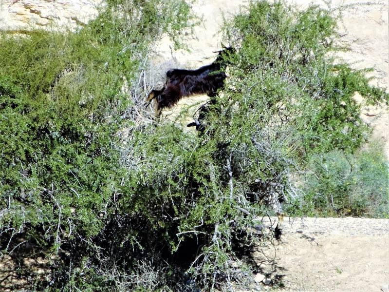 Opnieuw een wandeling vandaag, nu met vier Nederlanders en twee Belgen. Lia, Co , Frank en Ria en wij dus. Even buiten Tafraout ligt een kloof waar water doorheen stroomt. Niet het meest heldere water, het komt vanuit een zuiveringsinstallatie en is, afgaande op de lucht, nog niet helemaal gezuiverd. De voorgaande jaren hebben we geprobeerd door die kloof te lopen cq te klauteren, zowel de ene als de andere kant. Tot nu is het niet gelukt helemaal door die kloof te lopen. Vandaag dus een nieuwe poging. Het begin is hoopvol en we kunnen de kloof een heel eind inlopen. We passeren twee Marokkaanse dames met een enorme kudde geiten. De dames zitten te eten onder een boom en zwaaien vriendelijk naar ons. En terwijl wij aan de ene kant van de kloof lopen, lopen de geiten luid mekkerend aan de andere kant op de berghelling met ons mee. Tot plotseling met veel lawaai de dames rennend achter de kudde verschijnen. De meute wordt tot de orde geroepen middels kreten en een enkele steen. We zien met verbazing hoe de dames weer controle krijgen over de kudde: alle neuzen staan vrij snel weer de kant op waar ze vandaan kwamen. De wandeling door de kloof wordt geleidelijk aan een klauterpartij onder het mom van "we laten ons niet kennen". Tot we uiteindelijk niet meer verder langs het water kunnen en de bergwand op moeten. . Op de dichtstbijzijnde wand komen we tot halverwege, waar we ons vast klauteren. Dus weer terug, het water over en via de andere wand maar omhoog. En juist op dat keerpunt schieten er twee wilde zwijnen voor onze voeten weg. We weten dat die beesten hier zitten, maar je ziet ze zelden. Ook dit waren snelle jongens: te snel voor foto's. We blijven nog een tijdje doodstil wachten, maar ze laten zich niet meer zien. Het vervolg van de klauterpartij is heftig en af en toe nog link ook. Vooral vanwege losse stenen en gruis waarop je uit kunt glijden. Na vijf uur avonturieren zijn we terug bij de campers. Het is dan inmiddels half drie en we vinden het mooi geweest voor vandaag. Nog lekker luieren in de zon, een beetje kletsen hier en daar en een spelletje kubb. Alweer een dag voorbij.