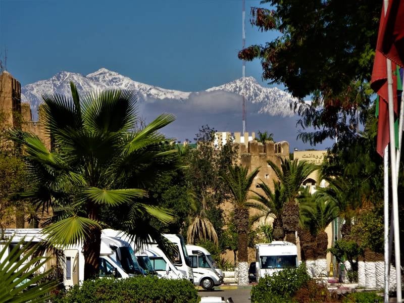 Afscheid van Aourir dus: van de wandelclub en van iedereen die wij kennen en ons kent. Wij gaan naar Taroudannt, zo'n honderd kilometer verder naar het zuiden. De eerste dertig kilometers van de route zijn prachtig. Via het dorp Alma door een bergachtig landschap naar de buitenwijken van Agadir. De weg van Agadir naar Taroudannt is uitstekend te berijden, alleen erg saai. Hoewel de besneeuwde toppen van het gebergte met de naam Hoge Atlas er indrukwekkend uitzien. In Taroudannt rijden we eerst naar Palais Salam: daar bij "de muur" is een parkeerplaats voor campers. Er is nog plaats en we worden keurig binnengeloodst door de "gardien". Tevens worden we begroet door Wim en Marlies, die we eerder in Oualidia en Aourir hebben ontmoet. Na een minder geslaagd bezoek aan de camping Le Jardin, hier vlakbij, zijn zij ook hier neergestreken. De camping zou overvol zijn. De stoelen gaan naar buiten en achter de campers maken we een soort terras, waar we in de zon gaan eten. Na het eten gaan we de stad in, we willen naar "het grote plein". En zoals elke keer als wij in Taroudannt zijn, lopen we weer helemaal verkeerd. "Het grote plein" zit er vandaag niet in. We stranden ergens op een terras en gaan aan de verse jus.