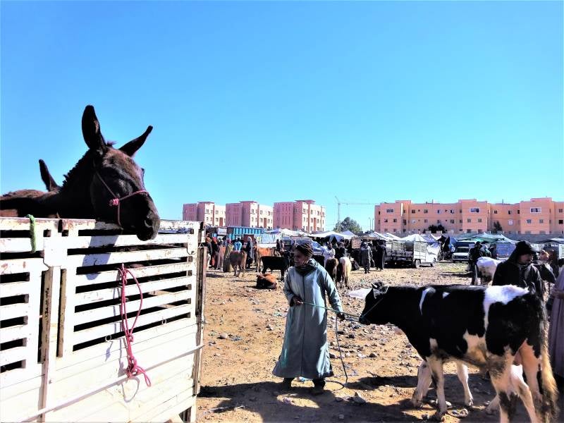 Op zondag is er een hele grote markt in Taroudannt. Daar gaan we naar toe, uiteraard na de vijf kilometer van Sven Kramer. Een markt met onder andere heel veel schapen, geiten en kippen. Maar ook koeien, ezels en paarden. Het is er enorm druk en warm: wat zullen die beesten blij zijn als de zondag voorbij is. We nemen ook nog een kijkje bij de afdeling sloophout en oude metalen. We zijn hier een paar jaar geleden ook geweest en volgens ons ligt en hangt er nog hetzelfde assortiment als destijds. Tot slot lopen we nog een rondje Taroudannt en terug bij de camper gaan de stoelen naar buiten. Aan het einde van de middag willen we nog even de tuin bekijken van Palais Salam, het hotel achter de muur waar wij voor staan. Vanwege een detectiepoortje maken we de receptionist wakker. Enigszins ontstemd krijgen we te horen dat we voor dertig dirham, € 2,70, de tuin in mogen. Nou dat doen we dus mooi niet: we verontschuldigen ons voor de storing en gaan terug naar de camper.