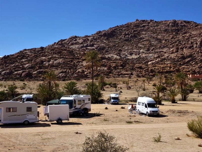 Het waarom is lastig uit te leggen, maar wij blijven Sidi Ifni een leuke stad vinden. Maar voor deze reis zijn twee dagen genoeg. Dat komt ook een beetje door het weer: het is opnieuw een bewolkte dag. We gaan weer rijden dus, nu het binnenland in. We gaan eerst naar de grote stad Guelmim (samen!). Er moeten boodschappen gedaan worden en even buiten Guelmim staat een grote supermarkt van "Marjane". En, evenals voorgaande jaren, staan er vooral campers op de parkeerplaats: en in de winkel meer personeel dan klanten. Met als voordeel dat je snel de winkel weer uit bent. Tijdens de koffiepauze op de parkeerplaats besluiten we naar de plaats Bouizakarne te gaan, een uur rijden verder. Als we daar aankomen blijkt de camping die we uitgezocht hebben, Bab Sahara, gesloten. Na wat puzzelen komen we terecht op een andere camping, in de regen, even buiten Bouizakarne, met de prachtige naam Tinnoubga. Een camping die wordt gerund door een ijverige familie. Geen stroom en wifi, maar verder zijn alle voorzieningen wel aanwezig. Zelfs warm water bij de afwasbak. Alleen afwassen en douchen tegelijk gaat niet. Tenzij je afwast onder de douche. Je kunt het een eenvoudige camping noemen, het heeft in elk geval iets aandoenlijks. Er staan hier nog drie andere Nederlandse campers. Eén stel kennen we van een website: Nies en Harry die ook reisverslagen bijhouden. Leuk om elkaar een keer "in het echt" te ontmoeten. Het is ondertussen weer droog geworden en we gaan wandelen. Het stadje Bouizakarne ligt op een driesprong van wegen naar het oosten, westen en noorden. Het is er dan ook razend druk met vrachtverkeer. En militairen vanwege een enorme kazerne. We moeten op tijd terug zijn op de camping vanwege een soort "happy hour" met thee en koek. Op kosten van de camping, in de nomadentent en bijna alle campinggasten zijn daarbij. Nogmaals het heeft iets aandoenlijks.