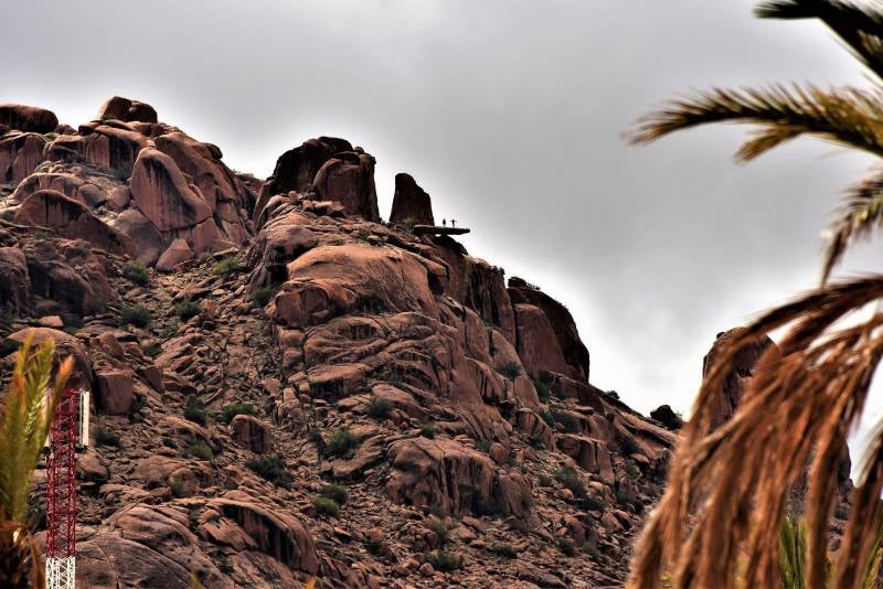 Het hoogtepunt van het Amandelfeest is voorbij. Dat was de zaterdag en dan met name de avond. Veel muziek op het grote podium en een plein vol mensen en heel veel oud-Marokkaanse cq oud-Hollandse spelletjes. De enige activiteit op zondag is nog een wedstrijd kleiduiven schieten, pal achter de camperplaats. In tegenstelling tot vorig jaar een saai gebeuren. Geen zang en dansgroepen om de boel op te vrolijken en erg weinig publiek. We hebben de indruk dat het feest dit jaar minder uitbundig was dan vorig jaar. Wij gaan nog maar weer eens wandelen naar de duikplank. Niet alle wandelaars van de groep zijn daar dit jaar al geweest. En wel naar Tafraout komen en dan niet naar de duikplank klimmen kan natuurlijk niet. We hebben er mooi weer bij en de vergezichten zijn opnieuw prachtig. Het klimmen, de fotosessies op de plank en het afdalen gaan allemaal goed. Tot de laatste kilometer. Op een vlak terrein hebben wilde zwijnen zitten wroeten. En in één van die gaten stapt Wobbie mis. Het gevolg is een verstuikte enkel, waarop in de loop van de middag een enorm ei groeit. Met verbandmateriaal van de buren, "schmertzgel", natte lappen en de voet omhoog, proberen we de schade te beperken. Aan het einde van de middag gaan we toch naar de hammam voor een douchebeurt. Op de fiets, want lopen zit er voorlopig even niet in.