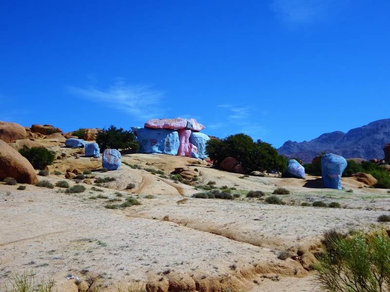 Na een bewolkt begin van de dag, zien we steeds vaker de zon, maar het waait af en toe behoorlijk. We gaan maar weer eens eten, een gegrilde "kip compleet" bij het kiprestaurant onder in het dorp. En we zijn niet de enigen. Op een geven moment zitten we met twaalf Nederlanders aan de kip. Niet duur en toch lekker, vandaar natuurlijk. Na de kip gaan we fietsen naar de "Blauwe Rotsen". Dat doen we elk jaar wel een keer als we hier zijn. De weg er heen loopt geleidelijk omhoog. Tot de afslag, waar het asfalt verandert in gravel. Die weg loopt als het ware om de vallei heen waar groepen rotsen van met name de kleur blauw zijn voorzien; lang geleden door een Belgische kunstenaar. We volgen de gravelweg en komen langs het naamloze dorp waar we deze week heen gewandeld zijn. Uiteindelijk komen we een kilometer of zes voor Tafraout, op een gewone asfaltweg weer uit. Al met al een rondje van zo'n vijfentwintig kilometer.