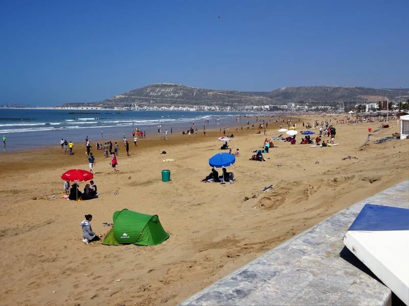 We gaan op weg naar Agadir. Eerst naar de supermarkt Marjane en daarna op zoek naar een parkeerplaats dicht bij de boulevard. Een soort gedoogplek waar je kunt overnachten, waarvan we de gegevens hebben gekregen van Piet en Elly. Het is er enorm druk, zoals overigens overal in Agadir, want het is zondag en daar hebben we even niet aan gedacht. Bovendien moet Agadir tegen Tanger voetballen: overal komen we groepjes uitgelaten Tanger supporters tegen. Op de parkeerplaats wordt er een plek voor ons gecreëerd door een bewaker: voorlopig staan we. We gaan wandelen over de boulevard met heel veel mensen op het strand. En op zoek naar een grote winkel, Uni Prix, lopen we zo maar de dierentuin in, gratis en voor niets en ook al druk. Veel vogels en pluimvee in enigszins gedateerde kooien, maar een mooi aangelegd terrein. Als we bij de grote winkel aankomen, mogen we er niet meer in: die is op zondag tot één uur open, en het is half twee: a demain madam. Even verder komen we langs een dameskapper, Valentino. We kennen de naam en de reputatie van alweer Elly en Piet. En hij is open en staat ons buiten al op te wachten. Terwijl er druk geknipt wordt binnen, gaat Wim een blokje om, waarbij het opvalt dat er heel veel gesloten is op zondag. Behalve kapper Valentino dan: het knippen en alles wat daar bij hoort neemt een uur in beslag en kost 100 dirham (€9,00). Het resultaat is er naar en dat mag ook wel voor die prijs. Maar we zijn in Agadir en de prijzen liggen hier op een ander niveau dan in het zuiden. Dat merken we ook op een terras: de koffie kost er omgerekend twee euro. En je kunt er zelfs een biertje krijgen, net zo duur als een kopje koffie. Ondertussen wordt er druk ge-whats-app't met Frank en Ria. Zij zijn vanochtend uit Tafraout vertrokken en zijn ook op weg naar Agadir. Contact in de zin van "waar staan jullie" en "is daar nog plaats". Nou alles is dus vol waar we staan, maar gelukkig weet Frank nog een alternatief. Even buiten alle drukte van Agadir op een stille plek. Om ons heen ligt iedereen te slapen, of beter gezegd iedereen is ingeslapen. Bij het kerkhof dus. We zitten nog lang buiten bij te praten. We hebben er heerlijk weer bij en het belooft een warme nacht te worden.