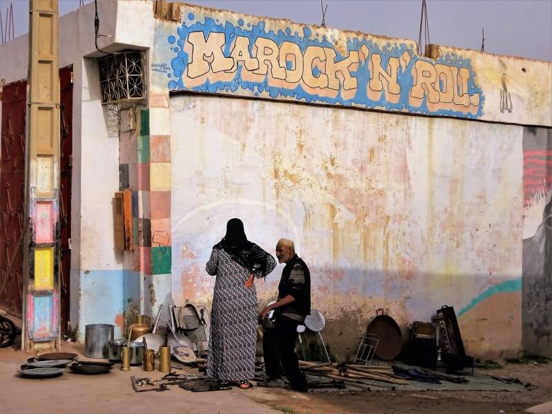 Een dag die qua weer fraai begint. Volop zon, weinig wind en een temperatuur die snel oploopt. We tutten, rommelen en kletsen wat, waarna we naar de markt gaan. Groente, fruit en vers gebrande pinda's kopen, een praatje met camperaars die er ook rond lopen en natuurlijk mensen kijken. Een markt in Marokko blijft leuk. Na het eten kunnen we een tijdje in de zon zitten. Tot er een harde wind opsteekt en er steeds meer wolken over komen drijven. We gaan nog even naar een schoenmaker in het dorp, drinken verse jus op het pleintje en gaan snel terug naar de camper voor lange broeken en vesten. Een spelletje kubb kunnen we niet meer afmaken omdat het begint te regenen. En dat gaat een groot deel van de avond door: regenbuien en windvlagen wisselen elkaar af.