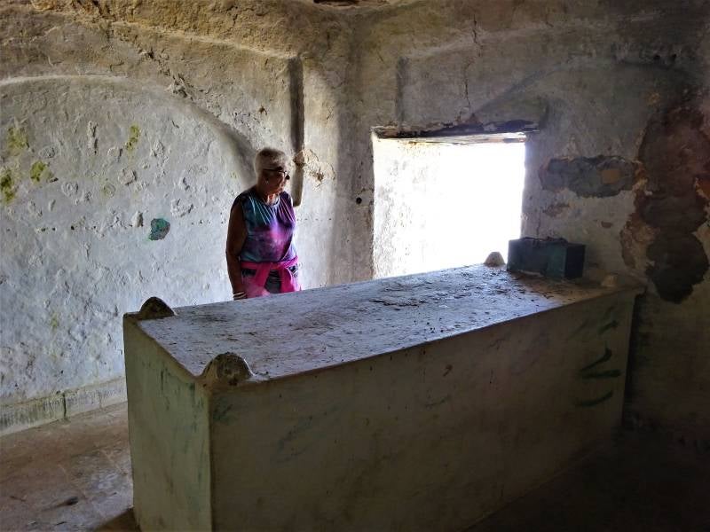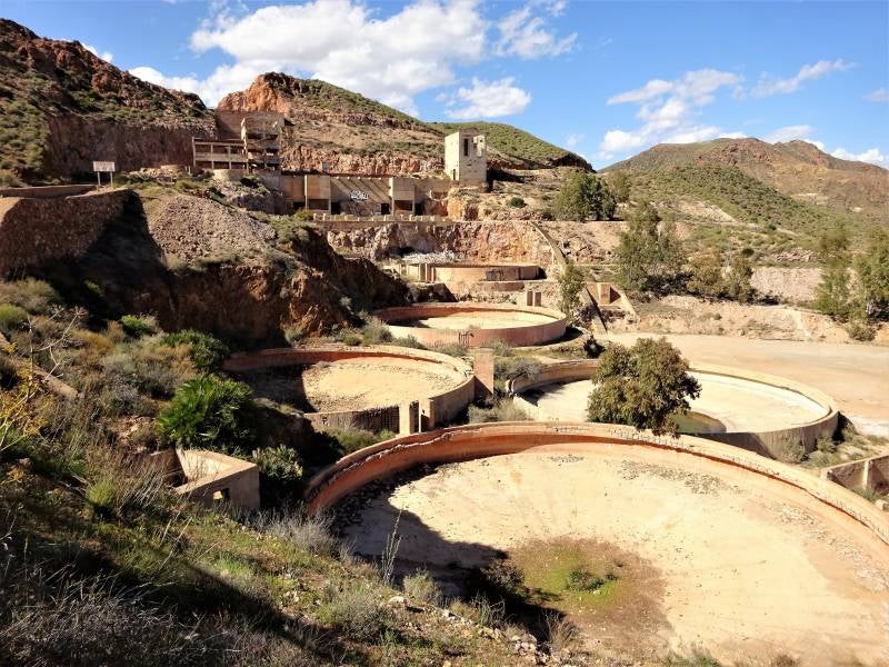 Op zondagmorgen gaan we maar weer eens douchen in de camper en ruimen de boel wat op. Waarna we terugrijden naar de parkeerplaats aan het strand. Daar waait het nog steeds erg hard. We doen een poging om uit de wind, in de zon te zitten achter wat muurtjes van de boulevard. Dat houden we vol tot een uur of drie, dan hebben we er schoon genoeg van. We pakken de boel in en gaan rijden. Eerst naar een parkeerplaats midden in het dorp Nijbar, een eindje het binnenland in. Vinden we eigenlijk niks en rijden verder naar het natuurpark Cabo de Gata. Daar ergens ligt een gehucht met de naam Rodalquilar, waar zich de ruïnes bevinden van een oude goudmijn. Een bizar dorp: de ene helft bestaat uit ruïnes van arbeiderswoningen van de mijn, de andere helft uit spierwitte vakantiebungalows. Het complex van de mijn zelf ligt een eindje boven het dorp. Er voor ligt een soort parkeerterrein en daar gaan we staan. In de luwte van de nog steeds harde wind, dachten wij, Maar daar denkt de wind heel anders over: kan die niet van achteren komen, dan maar van voren.