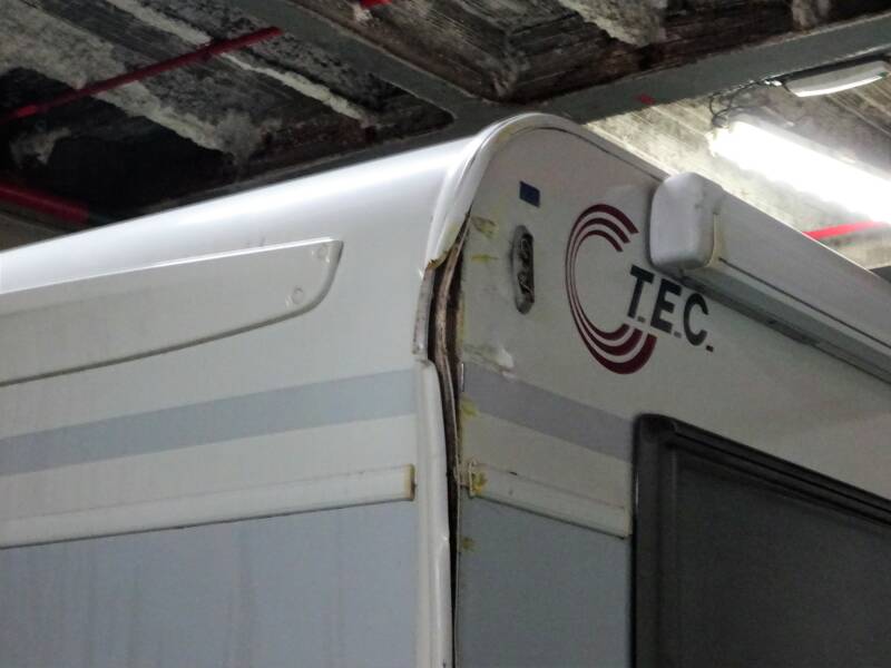 Zo mooi als het weer gisteren was, boven de twintig graden in Algeciras, zo slecht is het vandaag. We zijn al om half negen in de haven bij het kantoor van de bootmaatschappij Balearia. Daar krijg je de officiële tickets. Het duurt twee uur voor we de boot op kunnen: de Amman, klein, oud en krap. We worden een ruim in gedirigeerd en moeten stijf langs de wand van het ruim rijden. Gevolgd door een commando een scherpe bocht naar links te maken. En daar gaat het mis. Door de oversteek van de camper raken we een pijp die uit de wand steekt. Een hoop gedoe. Er wordt een medewerker bijgehaald die met een hamer de strip boven in de hoek van de camper weer enigszins in het fatsoen probeert te slaan. Vervolgens wordt de hoek dichtgesmeerd met een hele tube siliconenkit. Gewoon met zijn blote handen. Er komt een chef bij die een verklaring belooft van het voorval.