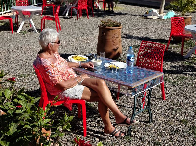 Tegen half twee gaan we eten bij het restaurant. De vrijdag is "cous-cous" dag hier op de camping. Op het terras is het een gezellige boel, alle tafeltjes zijn bezet. En een prima maaltijd voor weinig.