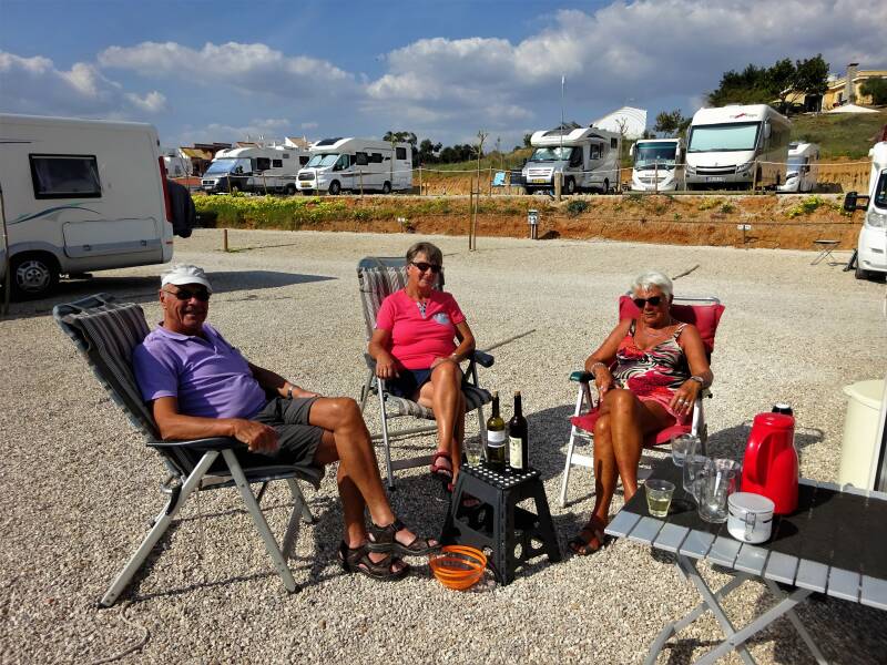 Naar Portugal dus vandaag, niet nadat we eerst nog wat boodschappen hebben gedaan bij de Lidl in Isla Cristina (lastig parkeren daar met een camper). In Portugal is het een uur vroeger dan in de rest van Europa en Marokko. We zijn dus vroeg in Manta Rota. En dat is maar goed ook, er zijn nog maar een paar plaatsen vrij. De prijs per nacht is nog steeds € 4,50, te betalen bij het vertrek. Nieuw is de toeristenbelasting. Eén euro per nacht per camper: en vooraf betalen. Na zeven nachten houdt dat op, dan heb je kennelijk genoeg betaald. Makkelijker kunnen ze het niet maken. Voor in de middag gaan we wandelen. Zoals elke keer wanneer we hier zijn, naar Altura, een dorp terug. Gedeeltelijk over vlonders en het strand. Met een tussenstop voor een verfrissing bij een strandtent. Het is inmiddels erg warm geworden. Terug bij de camper en goed en wel bijgekomen, krijgen we visite. Marinus, Catrien en Piet en Elly, die we kennen van de Marokkoreizen en de website toesjoeranroet. Zij zijn net aangekomen op de gedoogplaats naast de camperplaats. Een grote verassing om elkaar juist hier weer tegen te komen. Het wordt natuurlijk een gezellige boel: veel bijpraten, een hapje, drankje enzovoort. We worden uitgenodigd om morgen bij Elly en Piet op visite te komen: Elly is jarig! Tot we aan het begin van de avond het bericht krijgen dat de gedoogplek, waar ze staan, door de politie is "ontruimd". Ze zijn gevlucht naar Monte Gordo. Morgenvroeg gaan we er op de koffie.